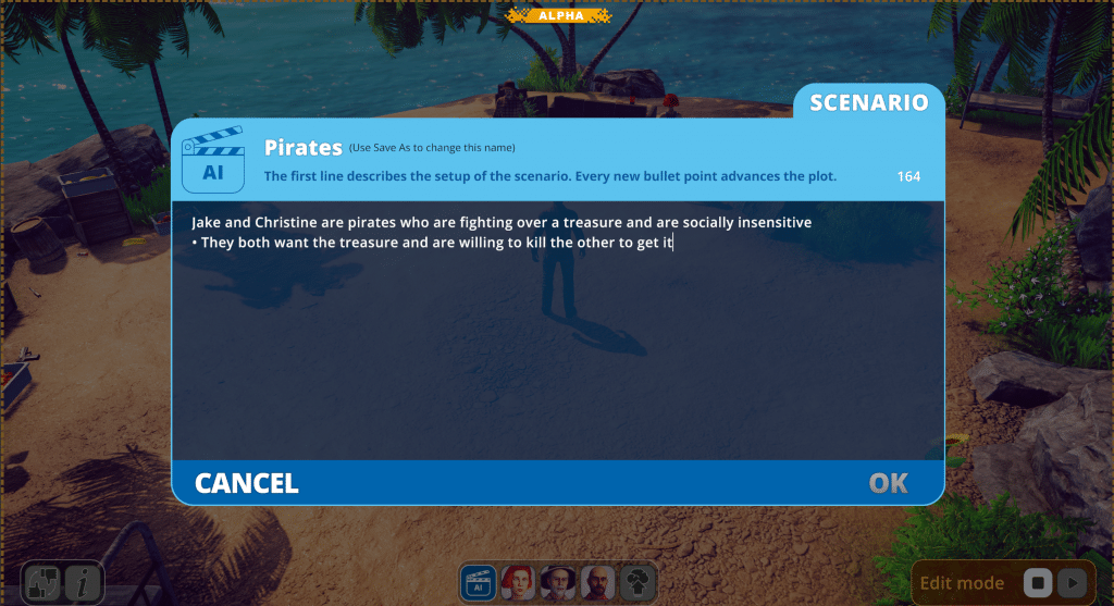 In this alpha version, AI NPCs can engage in conversations, make decisions based on their goals and surroundings, and interact with objects in the environment. While their behaviors can be surprising, they are still bound by the scenario’s overall structure. Players should expect to encounter limitations and occasional unpredictable behaviors as we continue to refine and expand the game’s capabilities.