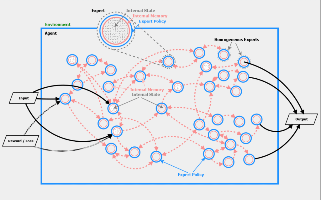 At GoodAI, we’re interested in multi-agent architectures that can learn to rapidly adapt to new and unseen environments we expect the behavior and adaptation to be learned through communication of homogeneous units inside a single agent, allowing for better generalization.